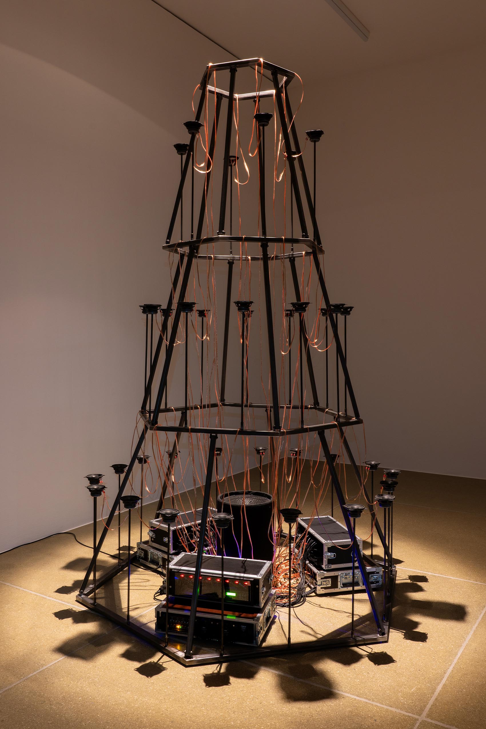 Visuals: Werkbilder der Klanginstallation «Babylonischer Quanten Klang Nr. 002», Ausstellungsansicht, Aargauer Kunsthaus, 2024 © Max Treier. Videostill «Display Hybrid RGB», 2023 © Max Treier. Performance «Maschinenraum», Performance im Kunstraum Baden, 2022 © Max Treier